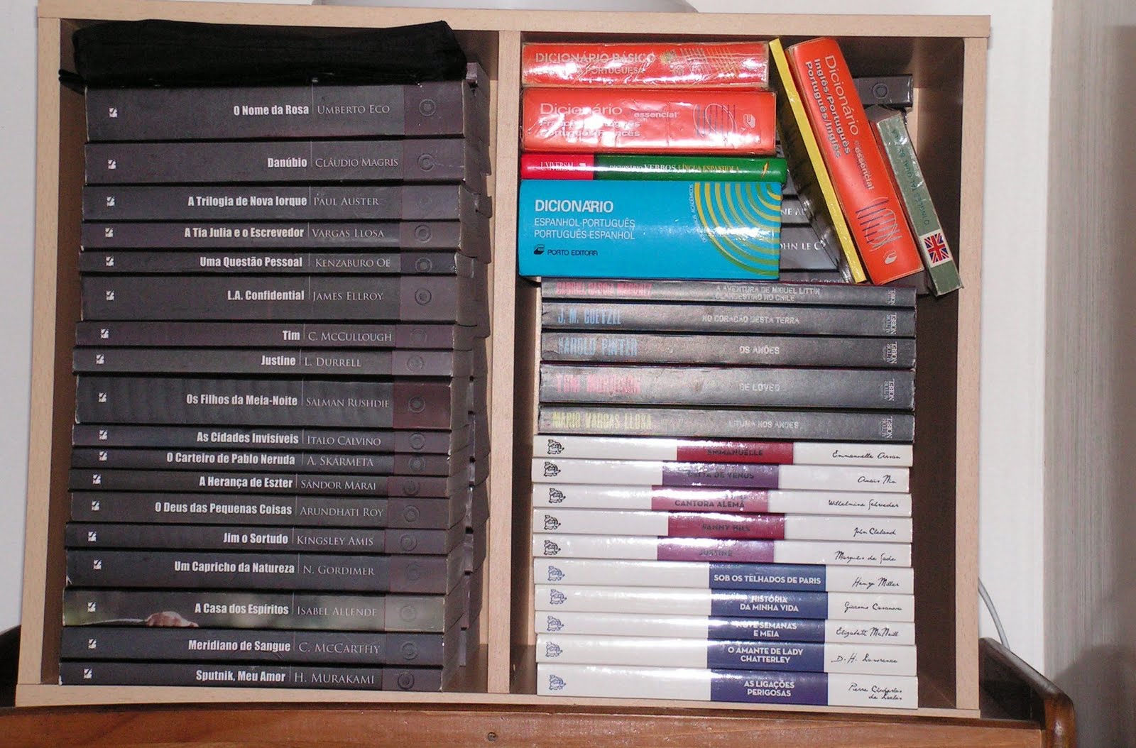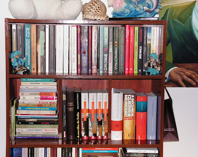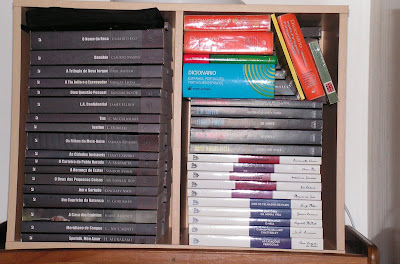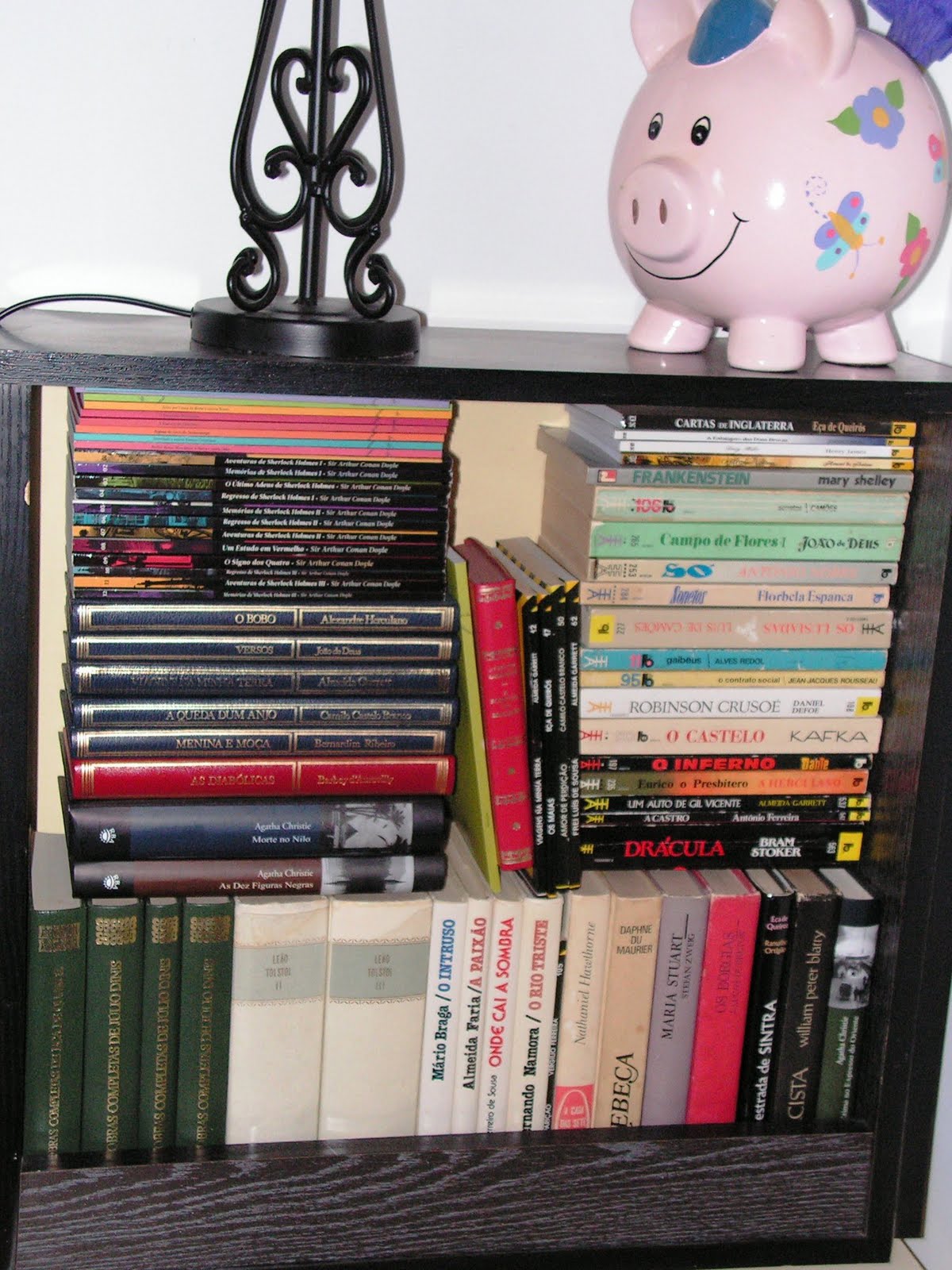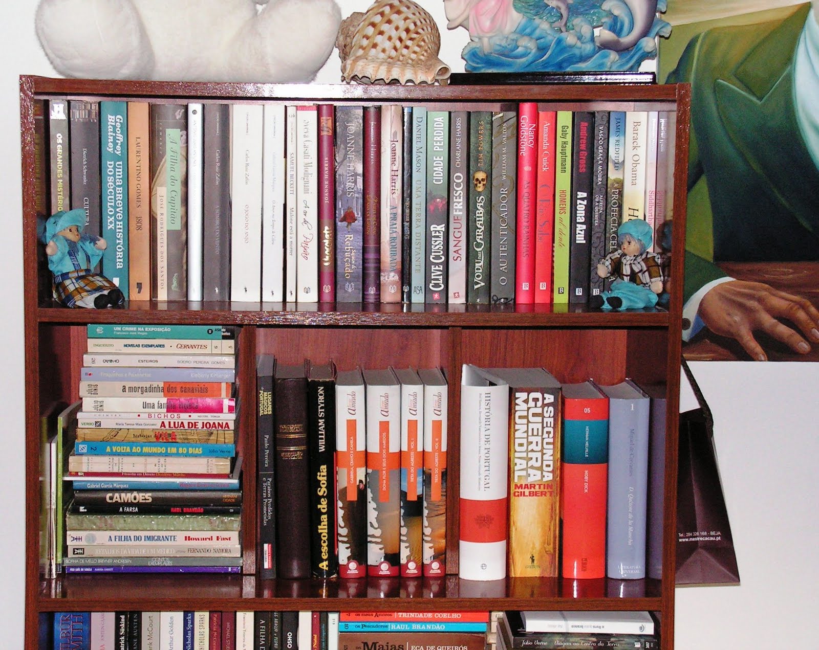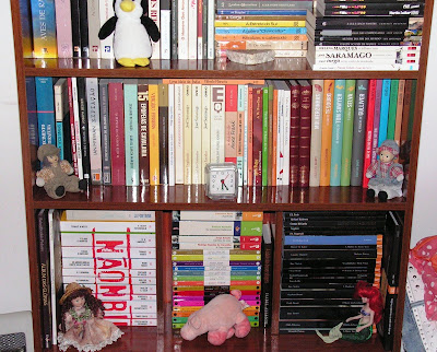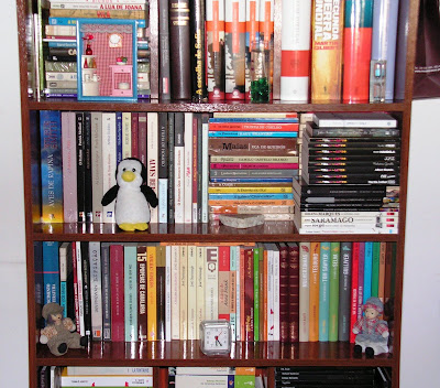 Há uns tempos publiquei umas fotos das minhas estantes. Como não eram suficientes e o meu quarto é pequeno, tinha que fazer um estudo aprofundado cada vez que comprava um livro, para descobrir onde o podia enfiar... Depois de muito pedinchar, tiveram dó do meu vício por livros e uma vizinha ofereceu-me uma nova estante. Eis o resultado:
